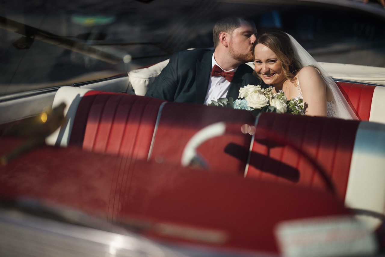 Whether parked beside a whitewashed chapel or gliding past the sea, the Cadillac brings a sense of fun and nostalgia that perfectly complements the joy of a wedding day.