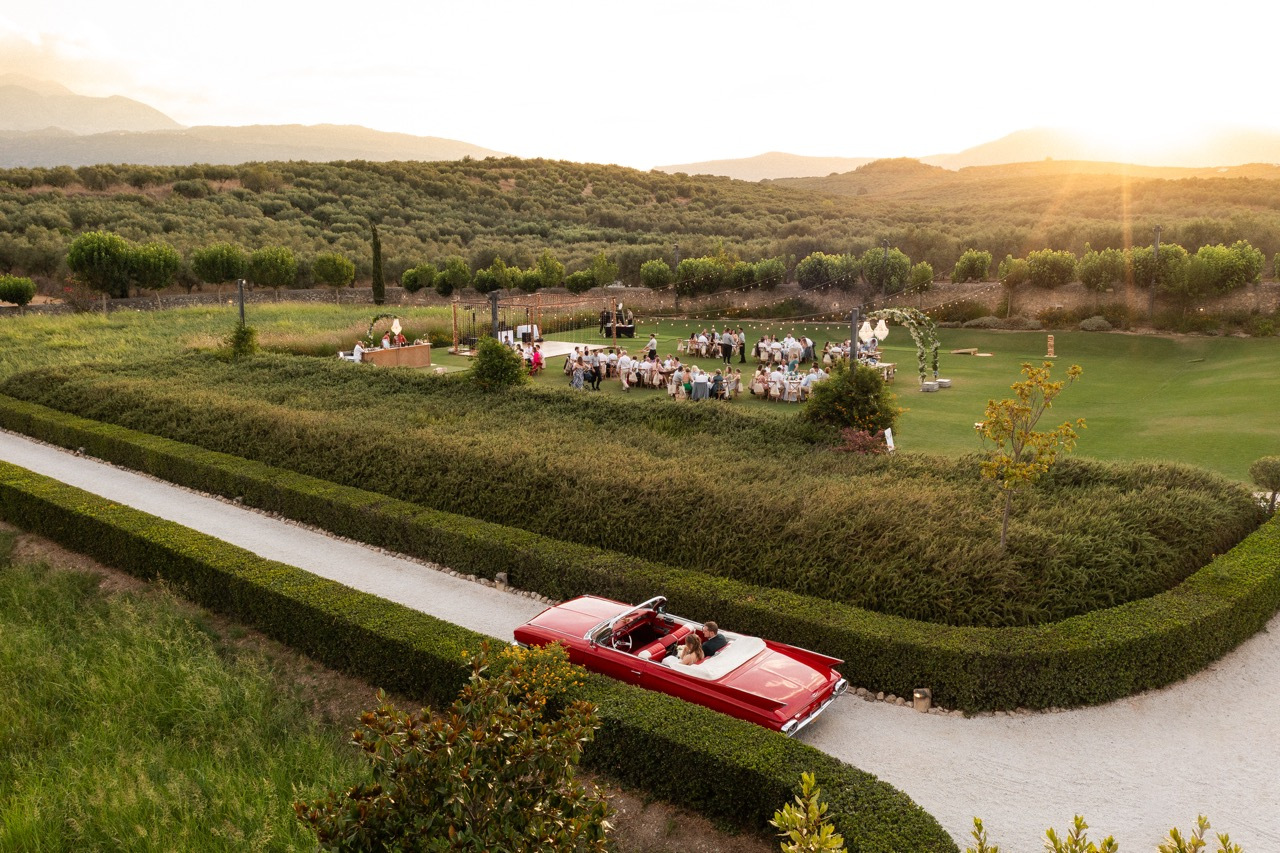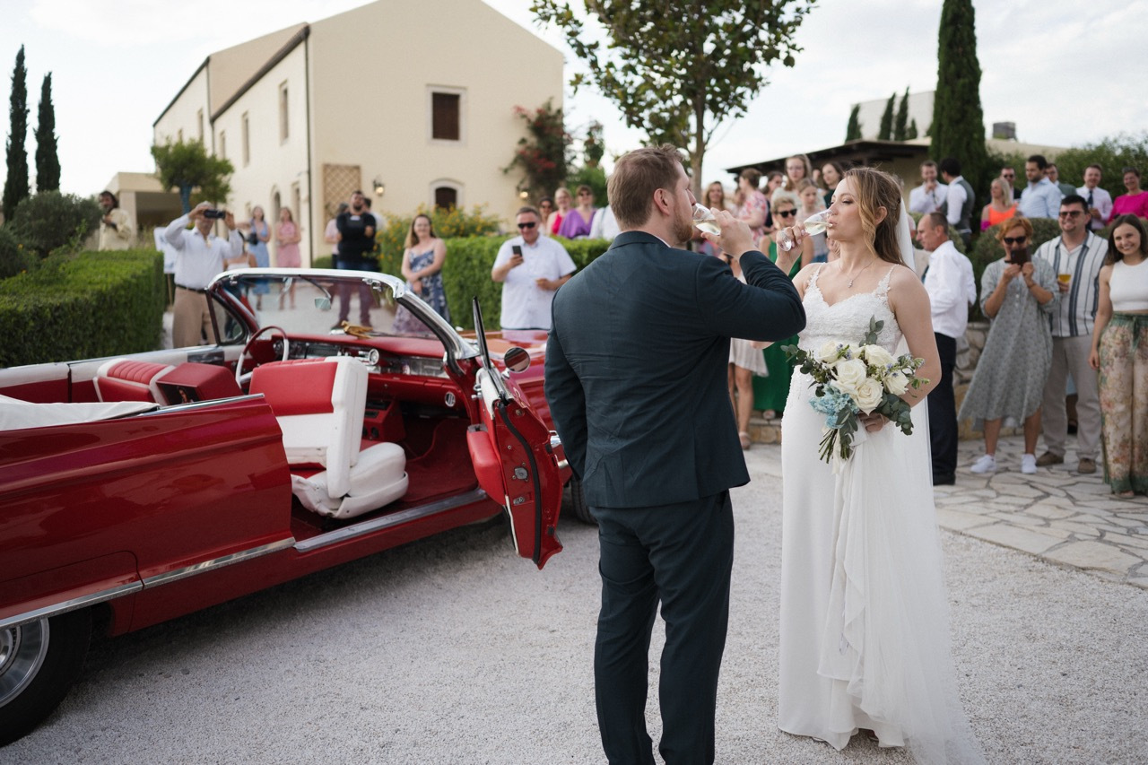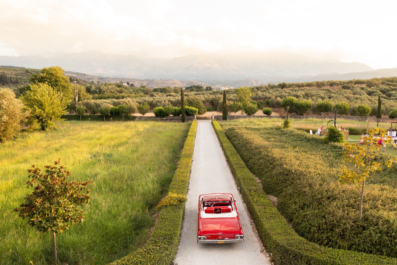 Nothing says vintage romance quite like a red Cadillac convertible. On Crete’s winding coastal roads, this classic car becomes more than just a prop — it’s a statement piece. The glossy red paint reflects the island light beautifully, adding a touch of cinematic flair to wedding portraits.